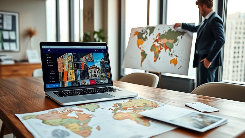 When researching foreign real estate markets, start by examining local listings and market data to spot trends and opportunities. Understand the target area’s demographics, buyer preferences, and cultural influences. Use technology like virtual tours and predictive analytics for better insights. Check legal requirements, taxes, and ownership restrictions carefully. Visit locations if possible and consult reputable agents. Continuing your exploration will reveal essential tips to help you make smarter, safer investment decisions abroad.