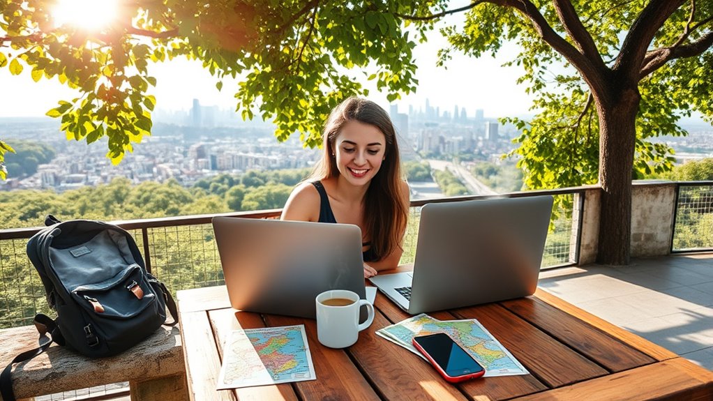 You find reliable internet worldwide by researching destinations beforehand, reading reviews, and asking fellow nomads for tips. You also carry backup options like portable hotspots, SIM cards, and VPNs to guarantee connectivity. Checking local cafes, co-working spaces, and accommodations with high-speed Wi-Fi helps. You stay flexible, adapt quickly if internet issues arise, and always have multiple ways to stay connected, so your work never gets interrupted.