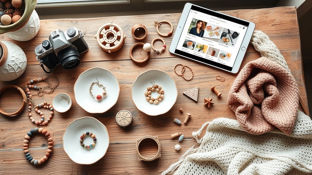 To sell handmade goods online, start by creating a compelling shop on Etsy, highlighting your unique, personalized, and eco-friendly products. Focus on high-quality photos, clear descriptions, and SEO to attract buyers. Engage customers through social media, tell your story, and emphasize your commitment to sustainability and ethics. With the right marketing and consistent branding, you can turn your craft into a successful business—keep going to discover more tips and strategies to grow your shop.