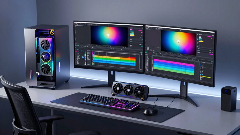 A high-performance graphics card is vital for efficient video editing, especially when working with high-resolution footage or complex visual effects. An GPU with at least 8GB of VRAM is essential to guarantee smooth rendering and playback. Modern GPUs that support 4K or higher resolutions allow detailed editing workflows without bottlenecks, making your process more seamless. Dedicated VRAM helps prevent slowdowns during intensive tasks like 3D rendering, color grading, and effects processing. Compatibility with professional graphics APIs such as OpenGL and DirectX ensures your editing software can leverage advanced features efficiently. Additionally, a GPU with hardware acceleration for encoding and decoding video notably reduces rendering times, boosting overall productivity. Investing in a capable graphics card directly impacts editing speed, quality, and efficiency.