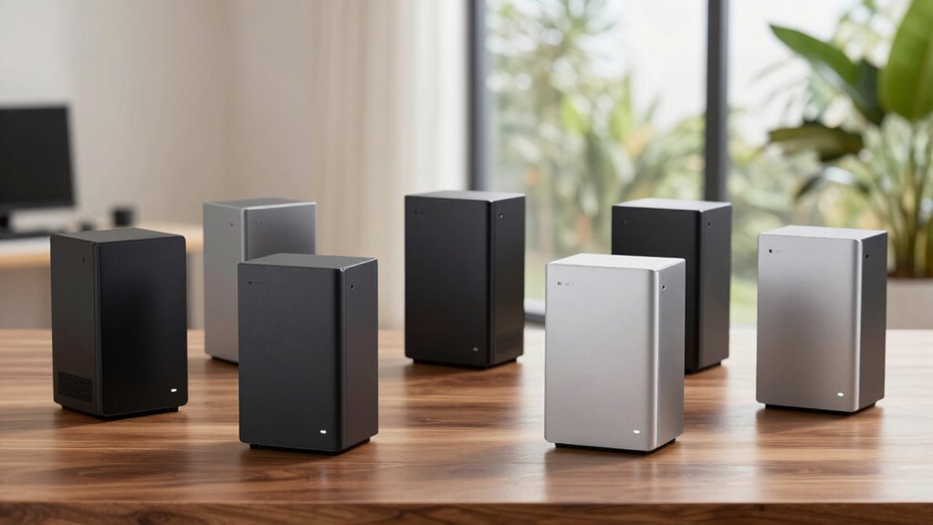 Space constraints play a crucial role in selecting the right mini PC for your home office, especially if you’re working in a small or cluttered environment. Mini PCs are designed to occupy minimal desk space, making them perfect for tight setups. Their compact size allows for flexible placement options, like mounting behind monitors or on wall brackets, helping you maximize your workspace. If space is limited, choosing a model with VESA mount compatibility can free up surface area by attaching it directly to the back of your monitor or wall. However, keep in mind that smaller form factors might limit internal upgrade options. Additionally, proper ventilation is essential in compact models to prevent overheating, especially when space is tight and airflow may be restricted.