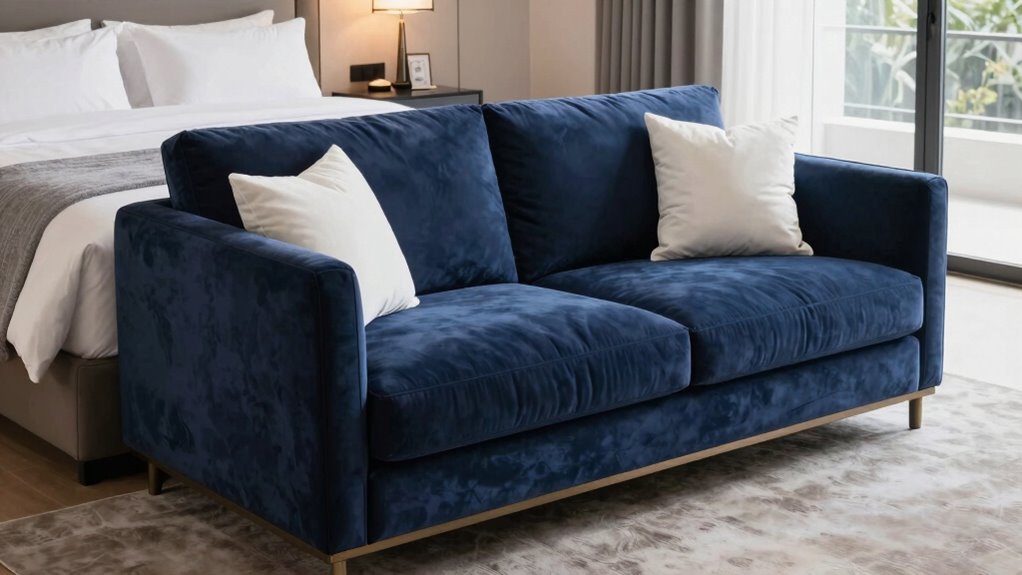 Choosing a sofa bed that matches your guest room’s decor is essential for creating a cohesive and inviting space. I recommend selecting a design and color that complement your existing furniture, whether that’s matching fabric or neutral tones, to guarantee harmony. Consider the shape and overall aesthetic—be it modern, minimalist, traditional, or eclectic—to match your room’s theme. A versatile style that functions well as both a sofa and a bed, without clashing with other design elements, is ideal. Pay attention to the upholstery and frame design to make sure they blend seamlessly with your interior style. This careful matching helps create a unified look, making your guest room feel polished, comfortable, and welcoming for visitors.