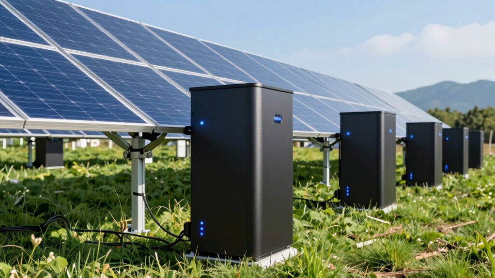 When choosing a solar generator for blackout preparedness, considering battery longevity is essential, as it directly impacts how long your power source will serve you reliably. Battery lifespan is often measured by charge cycles—how many times a battery can be fully charged and discharged before capacity drops below 70%. Lithium Iron Phosphate (LiFePO4) batteries stand out, offering over 3,500 to 4,000 cycles, which can translate to more than 10 years of use. Factors like deep discharges, charging habits, and operating temperature greatly influence lifespan. To maximize longevity, avoid full discharges and keep batteries within suitable temperature ranges. Proper maintenance ensures your solar generator remains dependable during extended blackouts, providing peace of mind when you need it most.