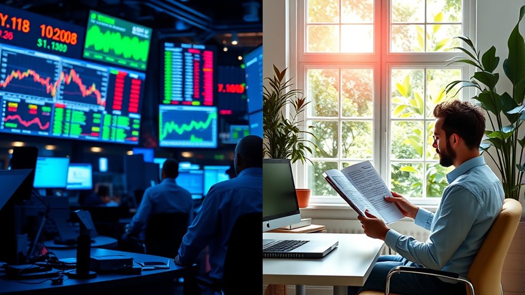 Think of your investments as a flexible dance. With active investing, you lead and change steps quickly, adapting to market rhythms. It offers you more control to buy or sell based on market signals, giving you agility. Passive investing, however, is like following a steady, predictable rhythm—less room for quick moves but more stability. Your choice depends on whether you prefer to choreograph your moves or stick to a consistent routine.