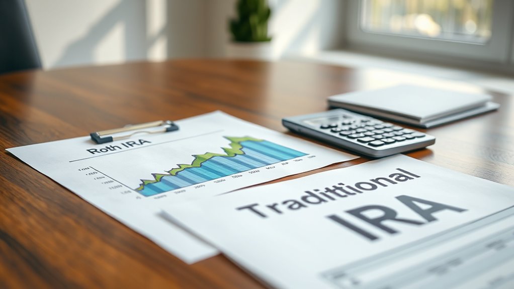 You can greatly impact your retirement planning by choosing between a Roth and traditional IRA. A Roth offers tax-free withdrawals in retirement, making it ideal if you anticipate higher future income. A traditional IRA gives you immediate tax benefits, lowering your current taxable income. Your choice determines how much you save now versus later. Planning carefully guarantees your retirement nest egg grows efficiently, aligning with your financial goals and expected future circumstances.